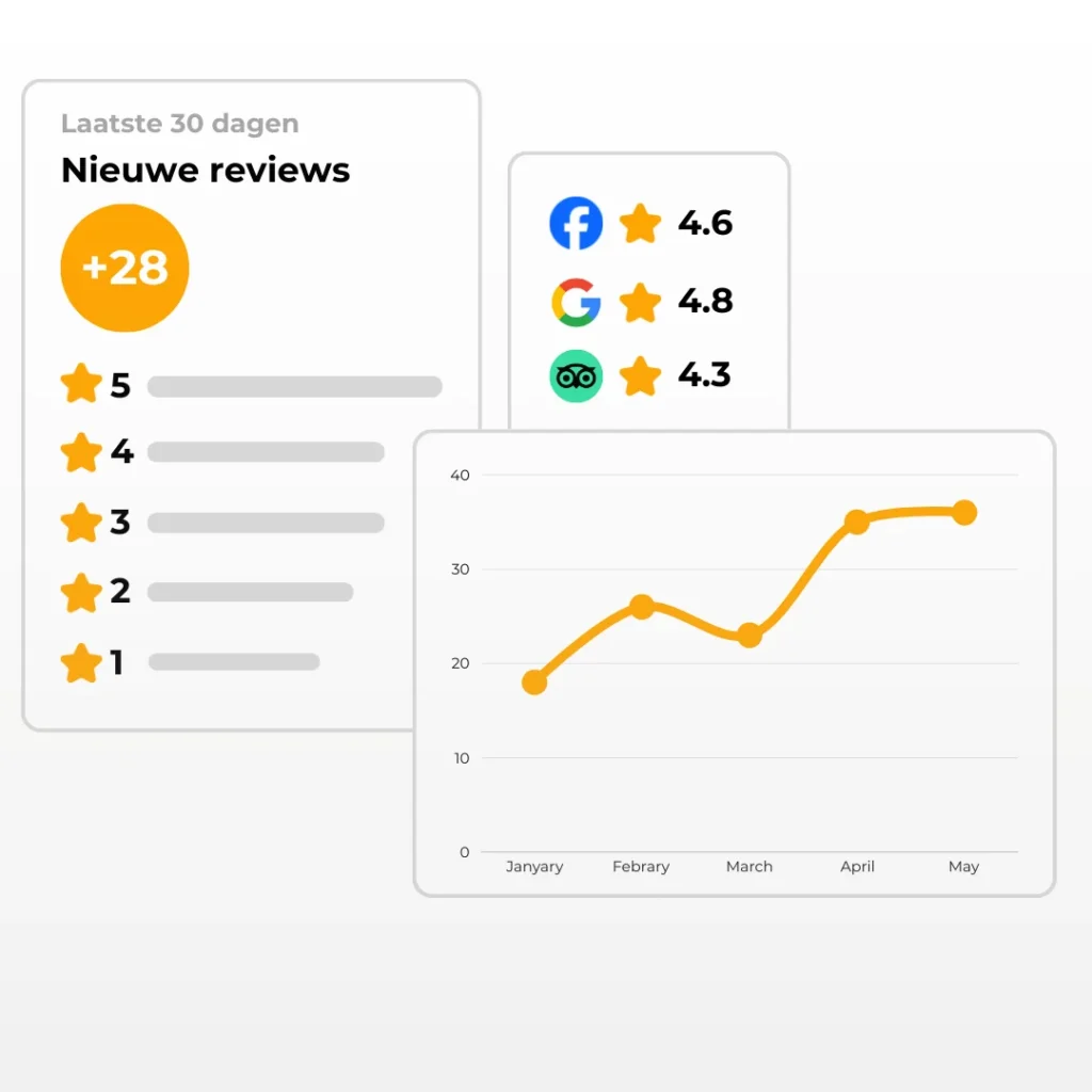 Onze software synchroniseert continu met de gekoppelde platforms. Zodra er een nieuwe review binnenkomt, zie je dit vrijwel direct terug in je dashboard en statistieken.