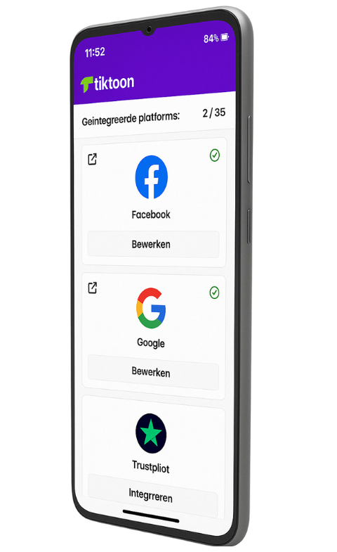 TikToon verbindt je met de belangrijkste spelers in de review wereld. Beheer reviews van Google, Facebook, Tripadvisor en nog veel meer, allemaal vanuit één overzichtelijk dashboard.