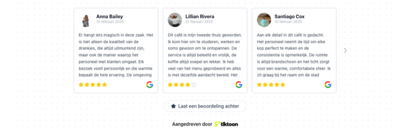 Bezoekers vertrouwen andere klanten meer dan je eigen marketingteksten. Met de slimme widgets van Tiktoon toon je jouw beste reviews direct op je website. Verhoog het vertrouwen, neem de laatste twijfel weg en zie je conversiepercentage direct stijgen.